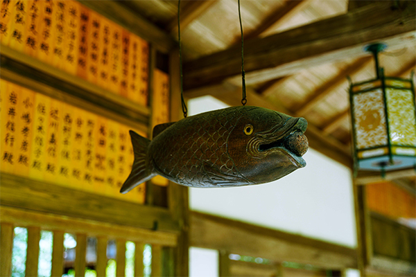 Wooden fish are often seen in Obaku and Soto sect temples. These fish are used to notify meal times when struck with a stick. Because fish sleep with their eyes open, the fish is a symbol to encourage priests to engage in training while sacrificing sleep. One of the essential teachings in Buddhism is to overcome greed, hatred and ignorance, which are known as the "Three Poisons," represented by the ball inside the mouth of the fish. This one is a scaled replica, but you can find an original at Manpuku-it Temple in Uii City.